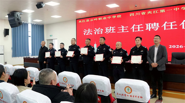 随后,民警邹敏代表全体法治班主任讲话。他说,夹江县公安局选派民警到学校担任法治班主任,旨在创新未成年人保护机制,打通校园安全“最后一米”。法治班主任将重点围绕法治教育、行为矫治、关爱服务三方面展开:通过普法宣传增强学生法治意识;通过跟踪帮教预防未成年人违法犯罪;通过关爱帮扶与安全整治守护学生成长。警校携手,共建平安校园。