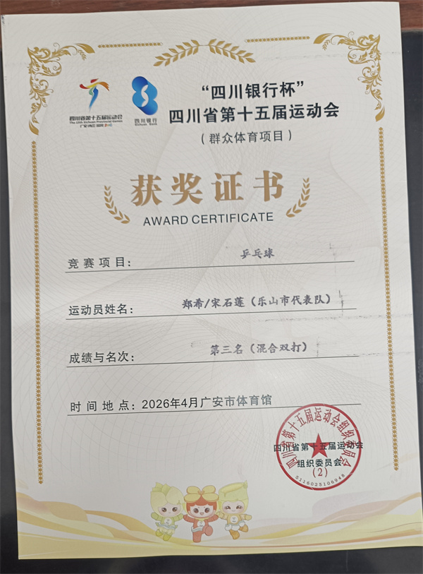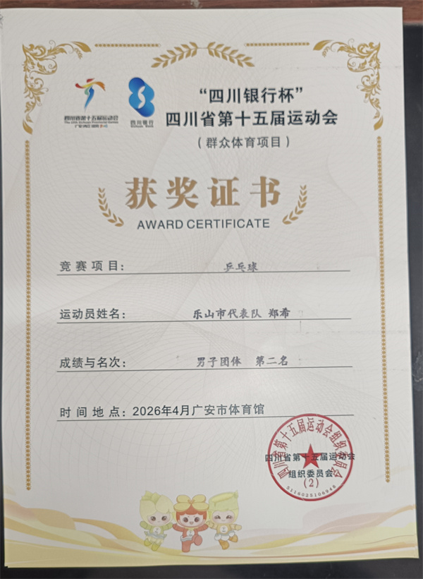 4月10日—14日,郑希老师征战四川省第十五届运动会群众体育项目乒乓球比赛,助力乐山市代表队勇夺男子团体第二名,并与搭档斩获混合双打第三名。