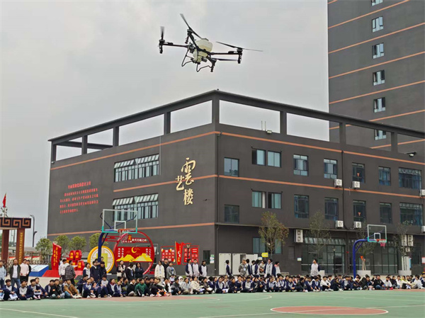 理论的种子需在实践中生根发芽。活动的第二阶段移至学校操场,将整个活动推向了高潮。在专业人员的引导下,同学们近距离观察了小巧灵活的小型航拍机和功能强大的中型植保机,对无人机的构造有了更直观的认识。