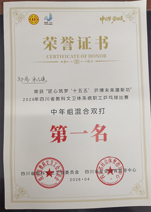 4月15日—17日,郑希老师再接再厉,在四川省教科文卫体系统职工乒乓球比赛中,与搭档默契配合,一举夺得中年组混合双打第一名。